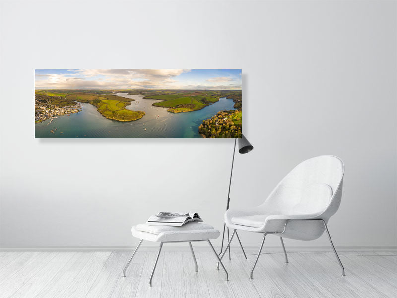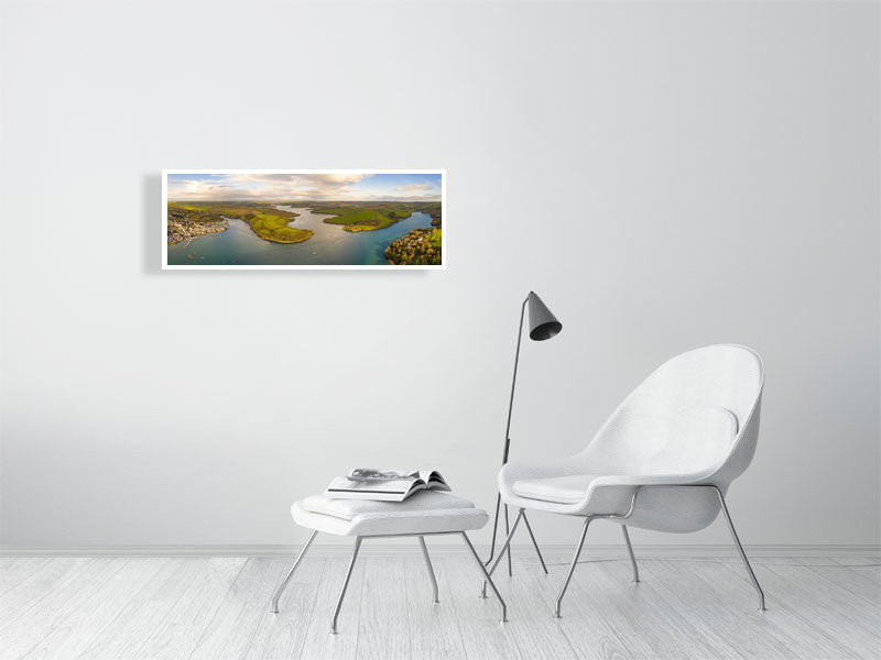A beautiful  patchwork of farmland meeting the water is revealed from a birds eye view.